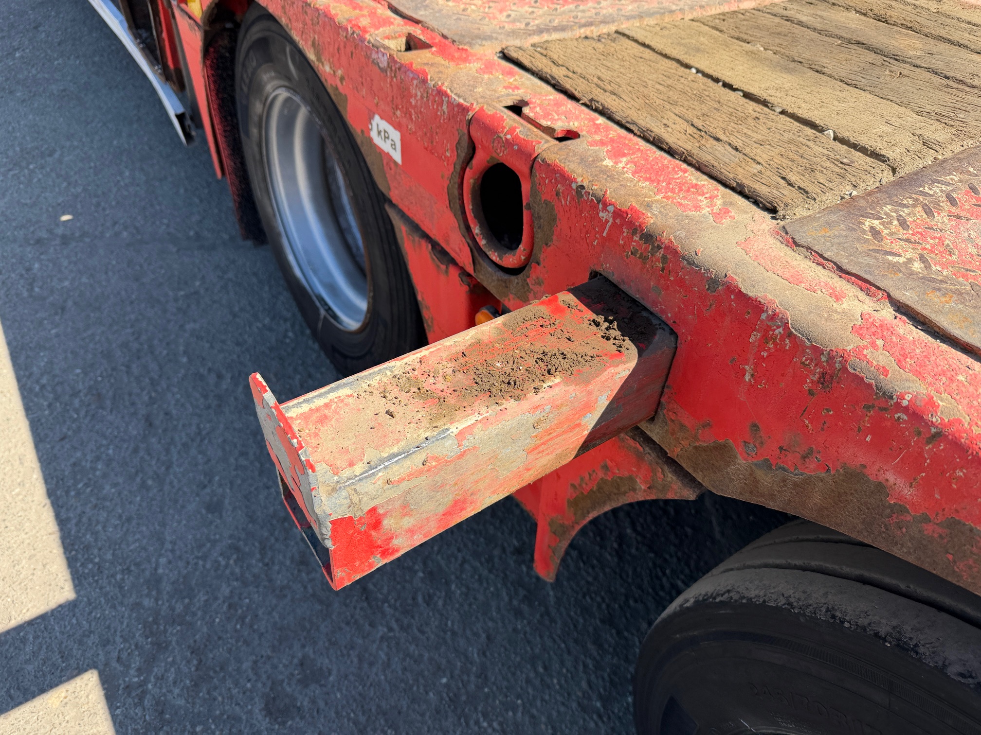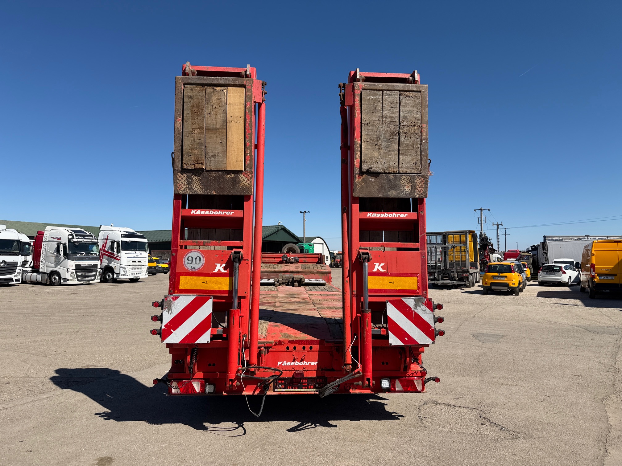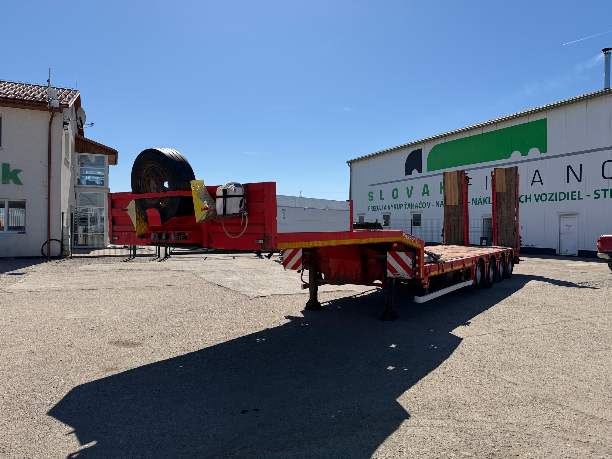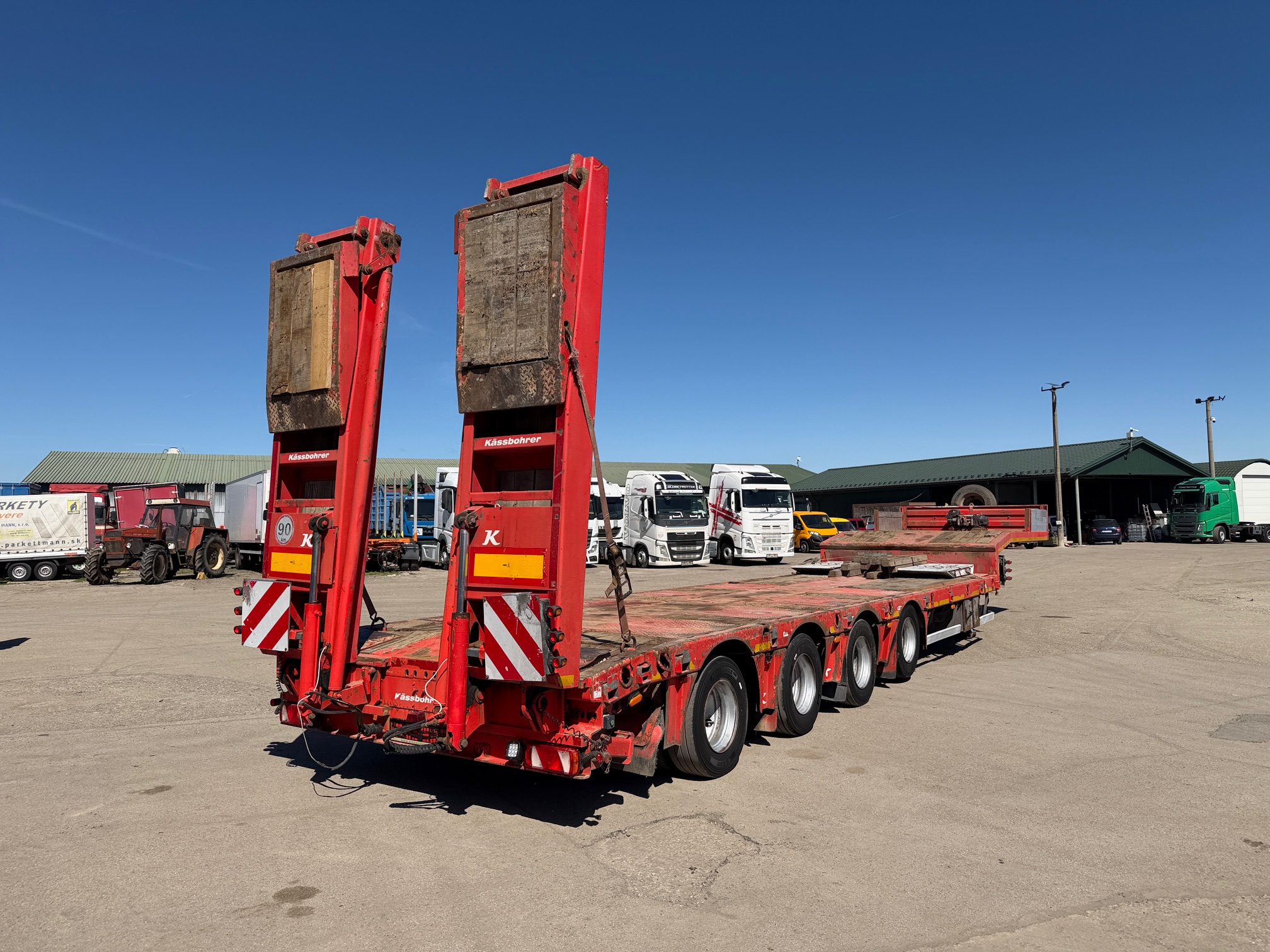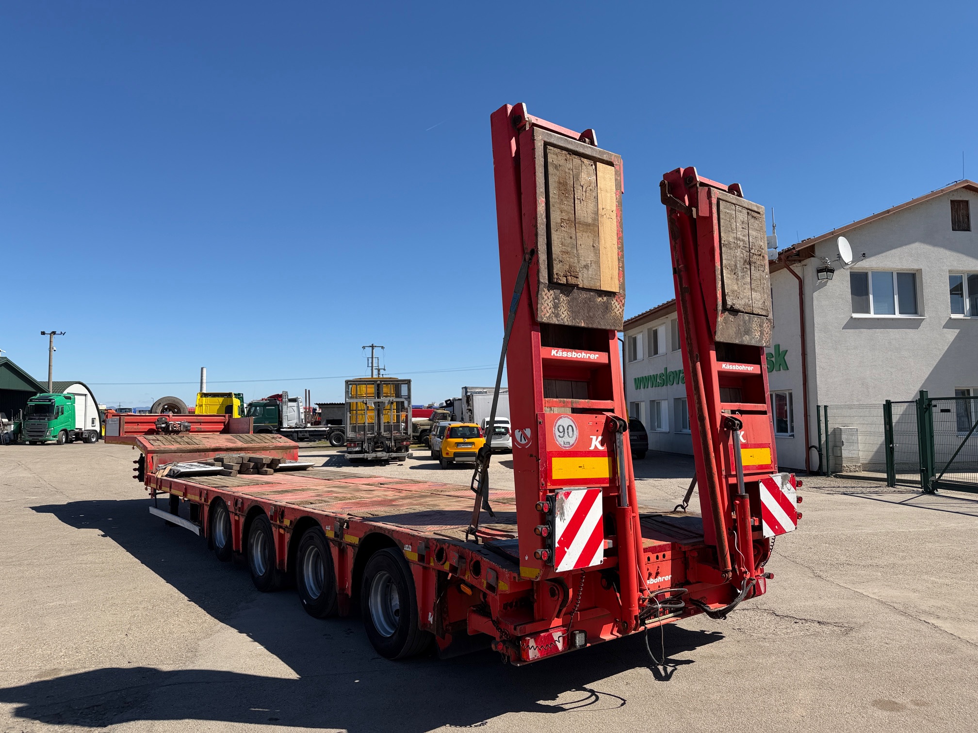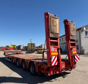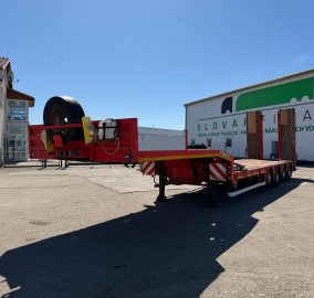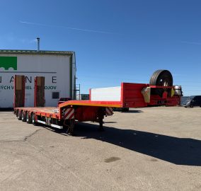 KASSBOHRER LOWBED podvalník r.v. 04/2016, bubnové brzdy, na vzduchu, štvornápravový, posledné 2 nápravy natáčacie; prvá zdvíhacia, hydraulicky sklápateľné nájazdy - nastaviteľné do šírky, 2x nájazdy na krk, rozmery: D- spodná časť - 9,3m, vrchná časť - 3,9m, Š- 2,5m (možnosť roztiahnutia o 30 cm do oboch strán), váha: 11520 kg, celková hmotnosť: 50000 kg, nápravy SAF, stav pneu: 60%, STK 06/10/2026, CENA= 29.900 EUR+DPH